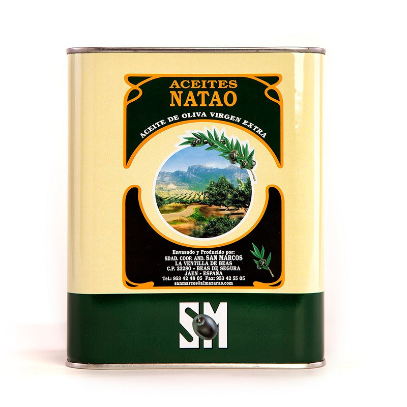 Latas de 2 litros de Aceite de Oliva Virgen Extra, presentado en cajas de dos unidades.